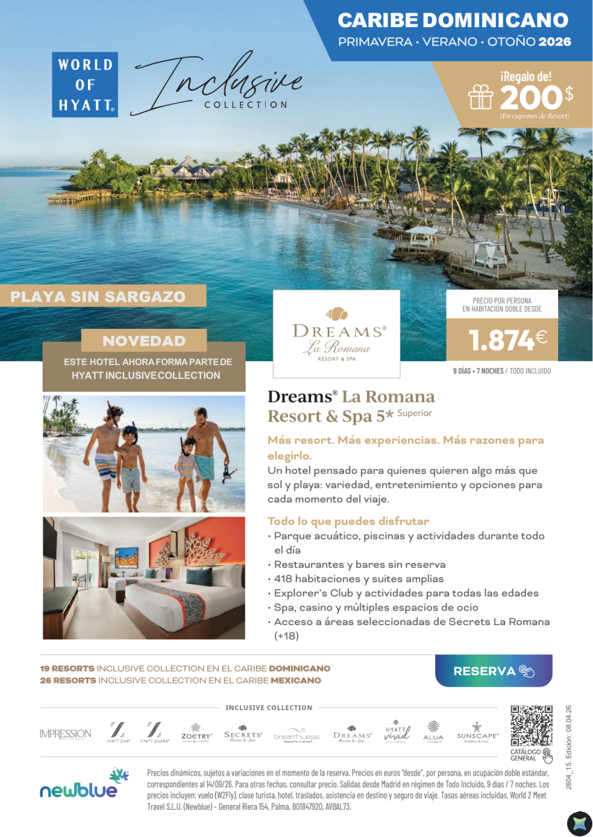 Una nueva opción sin sargazo en Rep. Dominicana. Dreams La Romana ahora es parte de Hyattt -Desde 1.874€ 9D/7